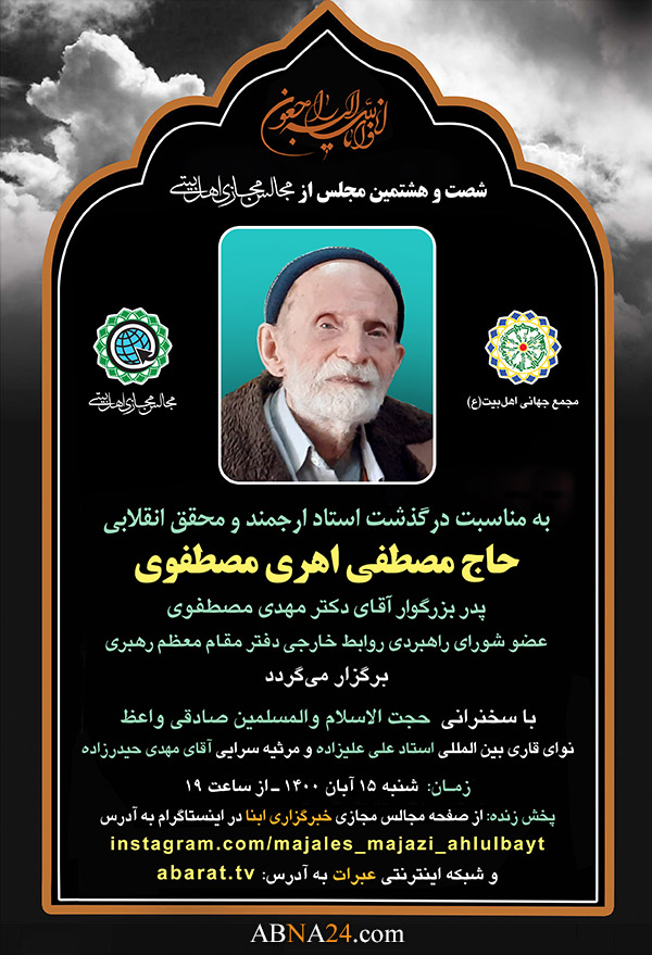 شامگاه امروز شنبه ۱۵ آبان ۱۴۰۰ مجلس شصت و هشتم از «مجالس مجازی اهلبیتی» برای بزرگداشت استاد ارجمند و محقق انقلابی مرحوم حاج «مصطفی اهری مصطفوی» پدر بزرگوار آقای دکتر «مهدی مصطفوی» عضو شورای راهبردی روابط خارجی دفتر مقام معظم رهبری برگزار شد. در این مجلس قاری بین المللی استاد «علی علیزاده» به قرائت قرآن پرداخت و سپس حجت الاسلام والمسلمین «صادقی واعظ»، سخنرانی کرد، در بخش پایانی مجلس نیز آقای «مهدی حیدرزاده» به مرثیه سرایی پرداخت. این مراسم از صفحه مجالس مجازی اهلبیتی (وابسته به خبرگزاری ابنا) در اینستاگرام به شکل زنده پخش شد و هم اکنون نیز فیلم آن در بخش IGTV این صفحه در دسترس علاقمندان قرار دارد.